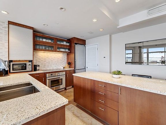 Enjoy unparalleled modern luxury with phenomenal views of the Hudson River and NYC skyline from this 1,774 sqft 3 Bedroom condo that is perched at the end of the pier. This gorgeous residence boasts an open floor plan which is great for entertaining! A large gourmet kitchen with designer finishes from Neff Kitchen, Ice Stone counter tops and top-of-the-line appliances! Master Bedroom has HUGE walk-in closet! There's 2 terraces, 2 wood-burning fireplaces, 2 assigned parking spaces and 2 storage areas! This is a full service community with amenities including; 24 hour Concierge, indoor pool, and state-of-the-art gym! Ferry, Light Rail, Bus and new Whole Foods market right outside your doorstep!