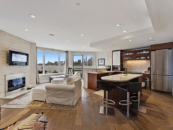 Enjoy unparalleled modern luxury with phenomenal views of the Hudson River and NYC skyline from this 1,774 sqft 3 Bedroom condo that is perched at the end of the pier. This gorgeous residence boasts an open floor plan which is great for entertaining! A large gourmet kitchen with designer finishes from Neff Kitchen, Ice Stone counter tops and top-of-the-line appliances! Master Bedroom has HUGE walk-in closet! There's 2 terraces, 2 wood-burning fireplaces, 1 assigned parking spaces and 2 storage areas! This is a full service community with amenities including; 24 hour Concierge, indoor pool, and state-of-the-art gym! Ferry, Light Rail, Bus and new Whole Foods market right outside your doorstep!
