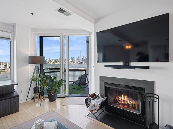Luxury and convenience can be yours at this highly desirable one bedroom, one and half baths condo with unobstructed views of NYC and the Hudson River. Both the ensuite bathroom and half bath are beautifully renovated. The open kitchen has a beautiful view of the city with stainless steel appliances and an airy living room designed for hosting dinner parties topped off with a real wood burning fireplace for post-dinner entertaining. New Washer/dryer in unit, one garaged parking space included. Enjoy the best of both worlds with townhouse style private entrance to each unit, and condo amenities including state-of-the-art gym, indoor heated pool, and 24 hr concierge. The best location on the Waterfront features Whole Foods, NYC Ferry, Light Rail and Bus all at your doorstep.