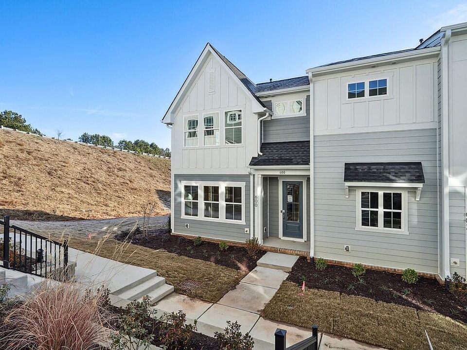 MOVE IN READYEnd Unit Townhome. Stunning luxury in the center of convenience is what you'll experience with townhomes in MEWs at Holding Village. The SAMPSON is a spacious 3 BR/2.5 Bath townhome with attached 2 car garage. Open floor plan with kitchen, dining & family room on the first floor. The kitchen includes a large island, pantry, pendant lights, & quartz counters. Luxury vinyl planks throughout the first floor. Oak tread staircase leads upstairs to a loft. Nice space for additional entertaining area or home office. The second floor also includes the primary suite with tiled shower and large walk in closet. Plus, Two additional bedrooms, full bathroom, and laundry room. 9ft ceilings on all floors. Other features include: tankless gas water heater, Ring doorbell, Schlage Front Door Lock, electric car charging outlet, whole house surge protector. The community features a 15 acre lake, pool, parks, and trails! A brand new clubhouse is opening soon! Minutes to schools, shopping, restaurants. Greenway access. Must See!!