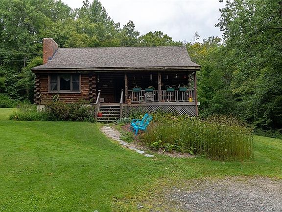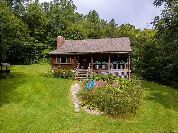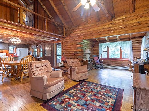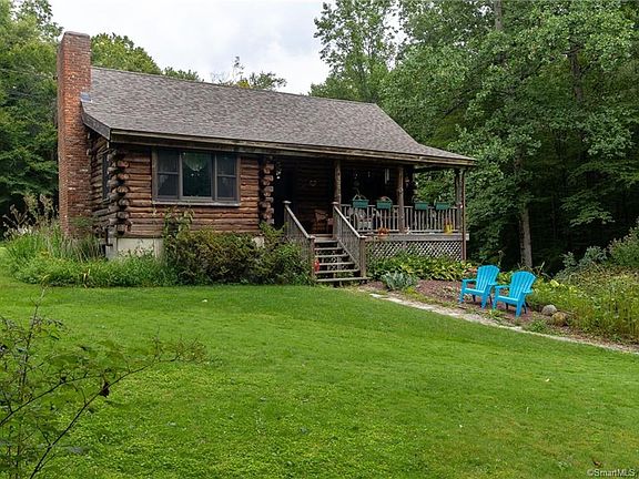 Vermont in CT, privacy galore at this log home, set beautifully in the hills. This very cool log home is immaculate, move-in condition offering 2000sf, 3 bed/2 bath cape style with first-floor bedroom. Enter onto the covered front porch into the cathedral living room with fireplace, open floor plan with kitchen and side door to large side patio with nice views of lovely yard. Upstairs are 2 large bedrooms plus full bath. Pride of ownership, new roof, large walk-out basement with laundry & utility sink & whole house wood stove. Located in a quiet area surrounded by Naugatuck Valley Forest. Convenient to Rt 8.