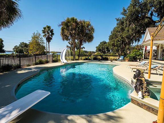 Paradise found in this one of a kind pool home over looking tranquil waters Gorgeous landscaping with majestic oak tree . Step inside to very open floor plan, formal DR is separated by columns but open to the large GR with FP ,all overlooking pool & Ocean Pond . Large kitchen& breakfast room with Granite tops, white cabinets & stainless app .1/2 BA off KT. Split floor plan. 2 BR share hall bath. Nice size MBR with large walk in closet, large bath with separate soaker tub and shower. Upstairs is a large bonus room & 4th BR. Step out of the Bonus room & walk across the open walk way to the 1050 sq. ft. garage apartment. One huge room consisting of kitchenette, full BA, LR & BR. Cypress walls & wood floors. Closet & storage. Has been used for Airbnb. Good income. Covered 30x30 carport. Salt water pool with combo hot tub, covered porch, 1/2 BA, all overlooking the water. 4 car garage,