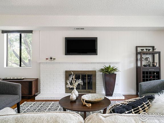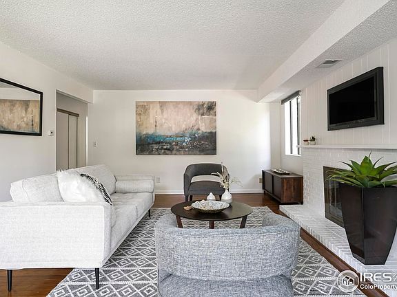 Soak in mountain views from this spacious residence situated in a coveted South Boulder location. Privacy abounds in a desirable end placement. The interior is wrapped in fresh wall color, inspiring a serene atmosphere. Hardwood flooring flows from the entryway to a living area grounded by a newly repaired gas fireplace and a dining room. Sliding glass doors open to a north-facing balcony with views to the west. An updated kitchen features stainless steel appliances, granite countertops and dark wood cabinetry. The large primary bedroom boasts views of the Flatirons and an en-suite bath with new LVP flooring, freshly painted cabinetry, new light fixtures and a new mirror. A second bedroom is complemented by a full bath with new LVP flooring and new light fixtures. Residents enjoy the convenience of a washer and dryer set and a new HVAC system. Community amenities include access to an outdoor pool. A central location offers proximity to the CU Boulder campus and I-36 leading to Denver.