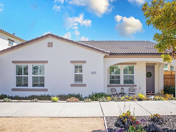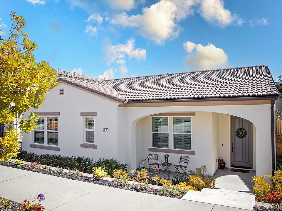 Single-story Bardin plan of the Layia Collection located within the presitigious SeaHaven community in Marina. This Spanish style 3 bed, 2 bath home is tucked away into a quiet double culdesac pocket of the community. Home has a proper entry ushering you into the living room space feat. soaring ceilings & plethora of natural light. Living room is open to the dining/ kitchen areas & feeds right onto the backyard through an oversized sliding door. Neutral-toned luxury vinyl flooring throughout the great room areas. Kitchen features custom "smoke" colored cabs, oversized island, subway tile backsplash, pantry, white cast-iron farmhouse sink & stainless Whirlpool appliances. White shutters featured throughout the home. Spacious primary bedroom is on opposite side of other bedrooms w/ ensuite bath feat. dual-sinks, walk-in shower & walk-in closet. Backyard is fully landscaped & easy to maintain with pavers & faux grass. Attached 2 car garage feeds right into home through stop & drop area.