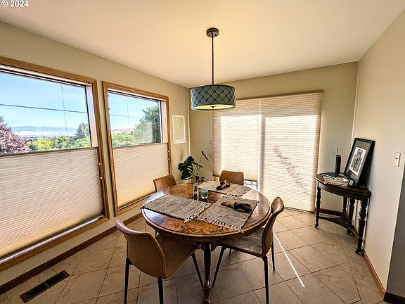 Beautiful hillside view house in stellar location, now available for sale in South La Grande! This house has excellent walkability to the hospital, schools, the track and EOU. The exterior of the home and the decks have been professionally repainted, there are beautiful new garage doors and the owners recently installed a new high efficiency HVAC system, including air filtration, humidifier and AC. The home has 4 beds, 3 baths, two living rooms and a family room. Amazing views of the mountains and valley. There is RV parking off street and a seasonal creek. The yard has a nice level section, but there is also a beautiful sloped hillside full of trees and ornamental shrubs. Call your agent for a tour today!