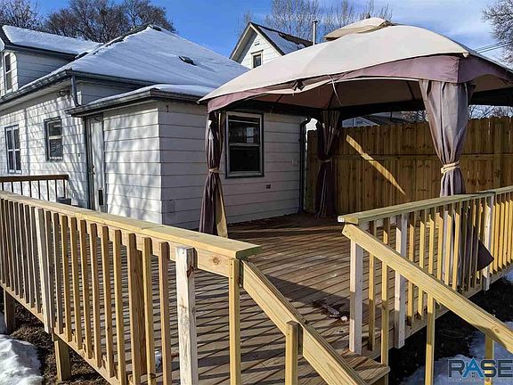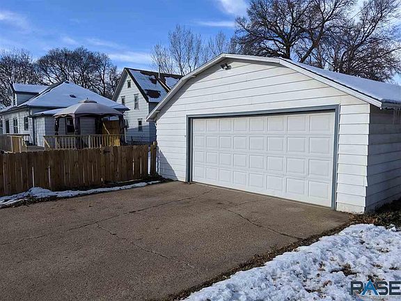 Don't miss this charming story and a half central Sioux Falls home featuring three bedrooms, one bath, and main floor laundry on a sought after corner lot with an oversized two car garage! The sun porch greets you, and you'll immediately enjoy the high ceilings and a home beaming with natural light as you enter the living room. A formal dining room sits just off the spacious kitchen. The main level master bedroom awaits, with the main level bathroom offering plenty of space and nice updates to fixtures. The upper level boasts two bedrooms, and ample storage in the unfinished basement below. Updates include electrical, new carpet on upper level and living room, a gorgeous privacy deck off the back, and new four foot wood fence surrounding this large yard.