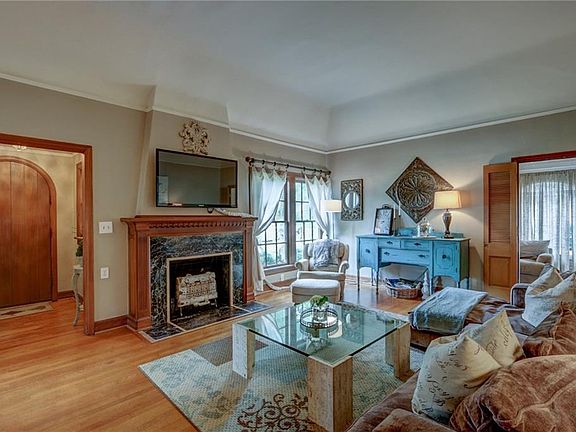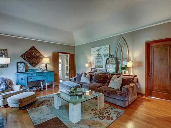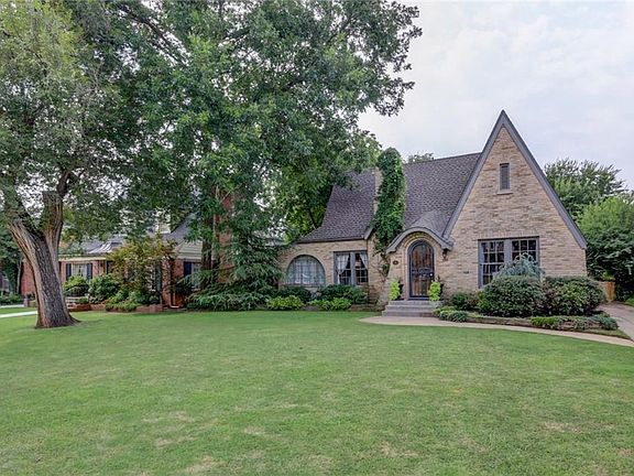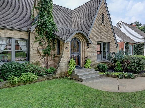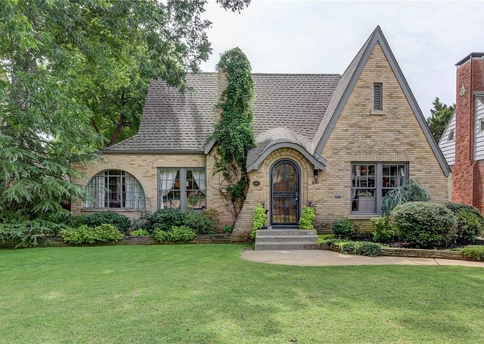 The architectural details are just stunning in this Old English Tudor in Crown Heights! Character & charm are what describe this home inside & out, with the updates you'll want as well. The living room boasts a gorgeous barrel ceiling with original mantle & fireplace logs. The kitchen is complete with granite countertops, subway tile back splash, stainless appliances, stainless back splash & butcher block for prepping next to the stove. Formal dining room is off the kitchen & living area, with great windows for natural sunlight & a crystal chandelier. Off the living room is a den, great for an office or TV room. Both bedrooms sit at the back of the house & are quite spacious. One of the bedrooms has an attached half bathroom. The hall bathroom has updated marble and subway tile with the original rounded tub and built-ins. Original hardwood floors throughout the house. The detached two car garage includes a laundry room. You will enjoy the lush backyard with mature landscaping.