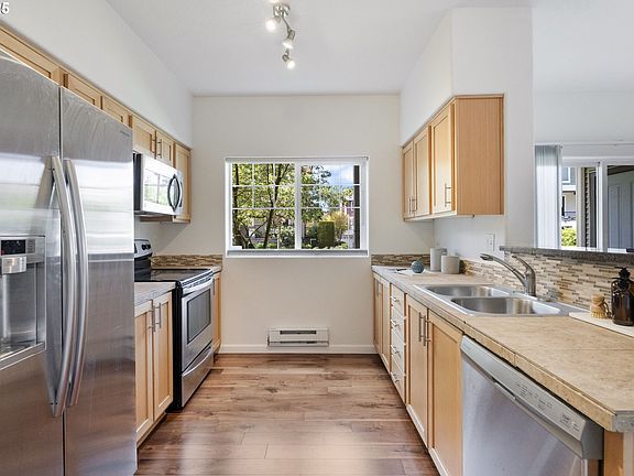 Check out this bright, fully ADA compliant, ground-level corner unit in the desirable Timberland community! Featuring 2 bedrooms and 2 bathrooms, this tastefully updated home offers an open-concept layout with abundant natural light, laminate flooring throughout, beautiful woodwork, and a cozy fireplace. The spacious primary suite includes dual closets and an accessible en-suite bathroom with a walk/roll-in shower and built-in seat. Laundry with stackable washer and dryer and a mini-split system for efficient heating and cooling. Detached one-car garage included. Incredible location 3 blocks to Market of Choice, shops, dining and coffee. Near Max station, Nike, Intel and St. Vincent’s Hospital. The neighborhood amenities: parks, scenic walking trails and a waterfall. HOA includes sewer and water!