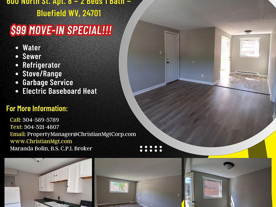600 North St. Apt. 8 ~ 2 Beds 1 Bath ~ Bluefield WV, 24701 $99 MOVE-IN SPECIAL First months rent is only $99 RENTAL ONLY: Security Deposit: $750. Can be made in payments if needed. Monthly payment: $750/month. Water, Sewer & trash are included. 2 bedroom, 1 bathroom apartment for rent. New paint & flooring throughout. Furnished with stove and refrigerator. Water, sewer & trash included in the monthly rent. All you pay is the electric bill. Electric baseboard heat throughout. New plank wood flooring throughout for easy cleanup. Storage closets throughout the apartment. Small porch for outside enjoyment. Too many upgrades to list! Conveniently located within minutes from Bluefield VA Walmart, shopping, entertainment, bus stop, etc. Move in today! Christian Management Corporation Office Hours: Mon-Fri 9:00AM-5:00PM & 10:00AM-2:00PM the 1st Saturday of every month You can view THIS property 7 days a week! Most pets welcome with a $300.00 pet fee per pet and signed pet agreement. Maximum 2 pets. No aggressive breeds due to insurance restrictions. Clean, safe, quiet, crime & drug-free are our priorities for our residents! We support Equal-Housing Opportunities! Good people with good, bad, low, or no credit but stable employment or Social Security are welcome. -MUST pass background check -NO evictions in the last 7 years -NO sex offenders Is this property not what you are looking for? View our other available #homes, #mobilehomes, #apartments, and more on our Facebook or our website!