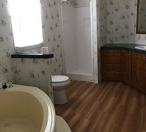 Newly painted all new flooring , carpet and vinyl wood look , some new plumbing and electric. Bath rooms have new toilets one new shower. Fresh new paint great neutral colors . Move in ready new exterior paint. Nice size fenced yard. Lamplighter village Mobile Home Park. Shed owned by the park. Large open kitchen /dining combo with tons of cabinet space. Large master bedroom with double closets and master bath with shower and soaking tub. Split bedroom design with 2nd bath and two bedrooms at other end of home. Space rent is $420 a month includes water and trash.