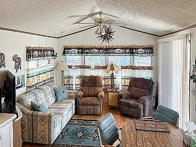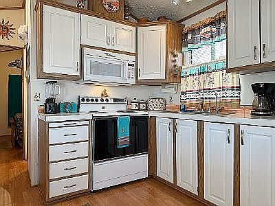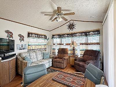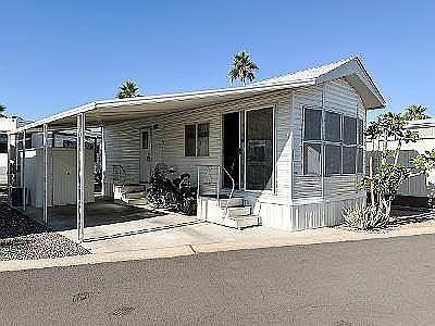 Fully furnished 1992 Fleetwood Park model located in a gated 55+ resort community in Apache Junction, AZ! Turnkey and move-in ready with all appliances, furniture, dishes, cookware, linens, and household items included. Features include new 3-ton AC/heat pump (2023), shingled roof, laminate flooring throughout, walk-through bath with full tub/shower, reverse osmosis system, white exterior sunscreens, covered carport, and storage shed. Interior has a fun Southwestern theme throughout, including custom backsplash, Coachella-style light switches and outlet covers, decorator window coverings and interior paint. This L-KIT open-concept floor plan offers a convenient kitchen and eat-in dining area that flows into the front living room. All electric with central AC & heat, this home is ideal for seasonal stays or efficient year-round living. Home is smoke-free and pet-free but is situated in the pet-friendly section of the community with a large dog-park less than a block away. Community amenities include a heated pool, (2) hot-tubs, fitness center, woodshop, pickleball courts, bocce ball, shuffleboard, cornhole, dozens of planned activities and more. Quick possession available and priced to sell!
