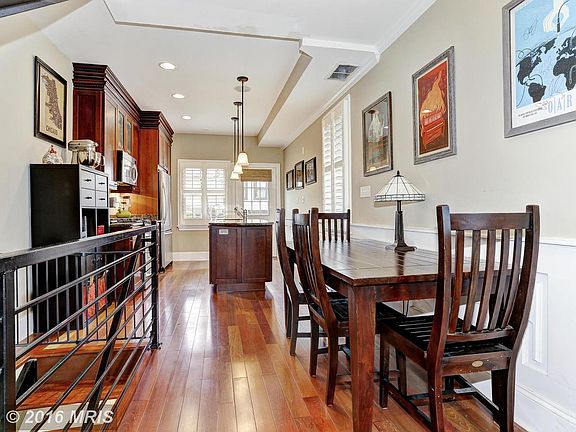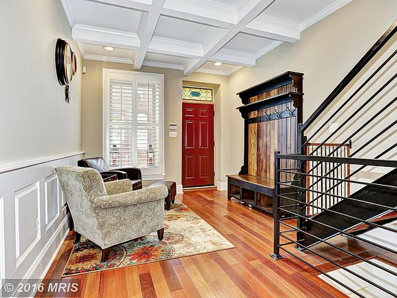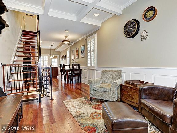 Gorgeous Canton end unit rowhome! Exceptional outdoor spaces include ROOF TOP DECK, Balcony, PATIO, and PARKING PAD in rear. Hardwood Floors thru open layout. Coffered ceiling, wainscoting & neutral palette.The top floor presents a master w/walk-in closet &luxurious full bath. WET BAR off deck. "3BDs and 2BA on upper levels". . Fin LL hosts a family room, full BA & laundry.