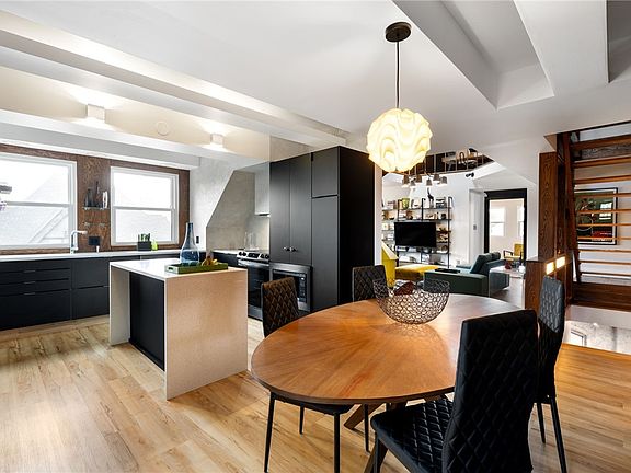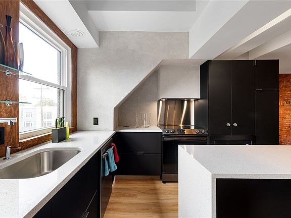 Thoughtful and timeless updates create a dramatic backdrop to one of the city’s most sought-after locations. This stunning penthouse condo features a private deck, two bedrooms, two full baths, in-unit laundry, and versatile flex/office spaces. Skylights illuminate the double-height living room, showcasing custom shelving and window treatments, all anchored by a vibrant mid-century fireplace. Recent updates ensure this unit is move-in ready, with matte kitchen cabinetry, solid surface countertops, and custom glass and iron interior doors. Housed within a 1920's colonial, this condo features the convenience of assigned off-street parking and is within walking distance of nearby universities, shops, groceries, and Bakery Square. Don’t miss the opportunity to make this your stunning new home.