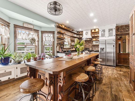 Step inside to find antique French doors and stair accents, all tied together with oak floors (2019) throughout the home. The open-concept kitchen has been meticulously remodeled with attention to detail, featuring an artisan island, granite countertops, updated cabinets, and stainless-steel appliances (all under 3 years old) perfect for hosting and everyday living.