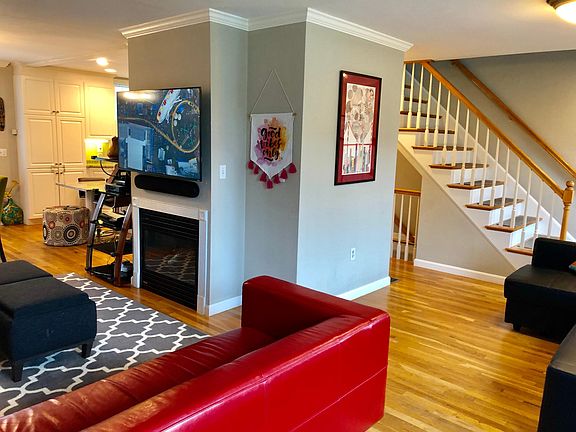 Outstanding condition townhouse with TONS of light throughout! This is a 3 bed 3.5 bath townhouse style condo with modern finishes throughout. Granite countertops, stainless steel appliances, spacious living-room and bedrooms. Laundry in unit, forced hot air heating with central AC, working gas fireplace! Two of the bedrooms (master and second bed) with high cathedral ceilings and lots of light! Third bedroom has full private bathroom on the first floor (could also easily be used as an office). One car garage with space in the driveway for one additional. Guest parking available as well. Discrepancy in public record sq footage vs. appraised sq footage. One year lease