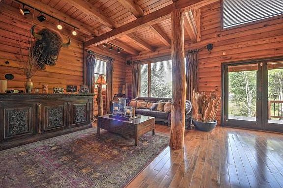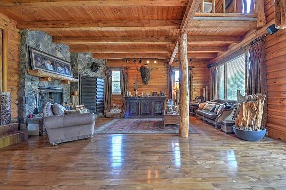 Own a little peace of heaven. This secluded, unique property features a stunning log home situated on 30 rolling acres of woodland and pasture. The home is a mixture of warm wood tones and contemporary white wash. The open floor plan invites large gatherings or intimate seating around the see through fireplace. The kitchen is spacious and well designed with stainless steel appliances and soap stone counter tops. There are four bedrooms and three and a half baths with high end fixtures. The master suite includes an office with built-ins, amazing master bath and walk-in closet. The lower level has two garages, storage and home gym. There is also a two car carport at the front for convenience. This wonderful home is surrounded by gorgeous landscaping nestled around the inground pool. Just past the house is a barn with a finished loft that could be used for living quarters or office space. Adjacent to the barn is a 2000 square foot helicopter hanger. This property should suite the most discriminating buyer. Make your appointment today to view this breath taking property.