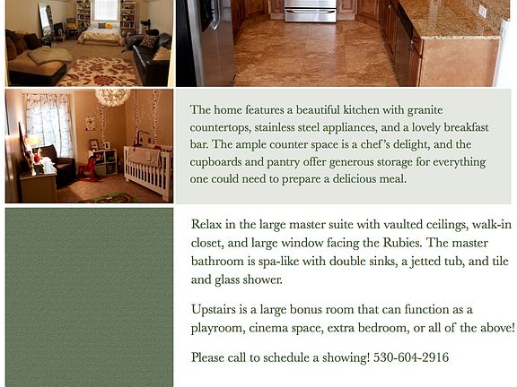 This home has numerous builder upgrades. hardwood in living room, expanded pantry, laundry room, kitchen, and granite counter top space. Kitchen has under counter lighting, Gas fireplace built in, tile master shower, bonus room 20x24 above garage with closet can be 4th bedroom. RV parking with full hookups. Garage was expanded at time of construction. With a spilt floor plan and open concept plan this is a very family friendly home. Wonderful views from the patio at rear of home. blue prints available