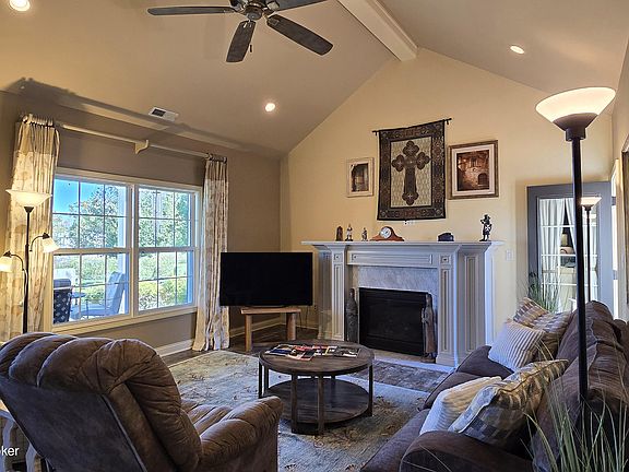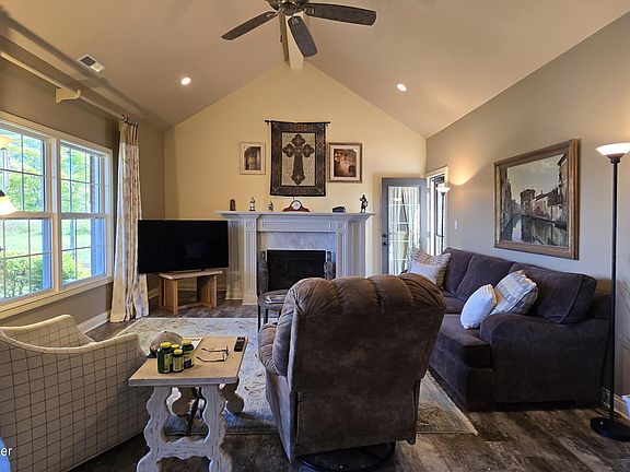 The gas fireplace is open concept; there are no bookshelves, just a cable outlet. All counter tops are high grade granite and match in all bathrooms. The backsplash is bead board which matches the countertop and the trim.The undercounters are well lit. The floor is luxury vinyl that looks like a barn floor and is maintained continuously across the ground floor. There is a jacuzzi style bath with an inline heater on the ground floor for those cold winter nights. The front patio has a fan as well as all bedrooms and the living room.