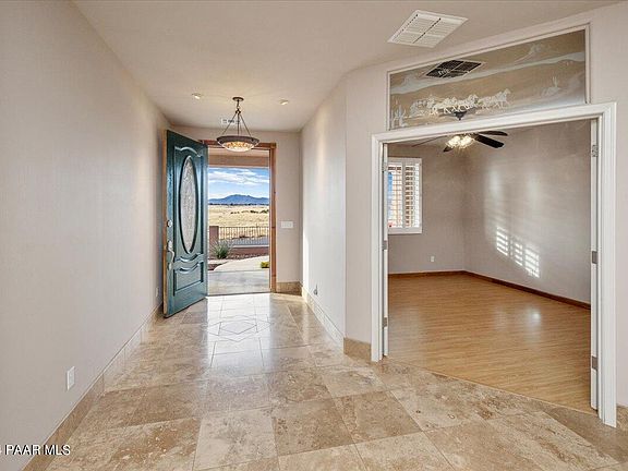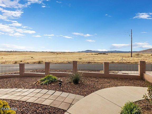 Welcome to your dream home! This meticulously cared-for 3 bedroom, 3 bath gem boasts numerous upgrades and breathtaking panoramic views of Glassford Hill & the Bradshaw Mountains right from your front porch. Step into a freshly painted interior that radiates warmth and charm. Wooden shutter window treatments add a touch of elegance throughout the home. Custom stone molding at the base of the flooring adds a distinctive look to every room. The great room features a stone fireplace and mantle, perfect for cozy evenings with loved ones. The primary bedroom offers a large walk-in closet featuring a wardrobe storage system. The ensuite boasts a dual vanity, upgraded walk-in shower with snail entry, and floor-to-ceiling stone tile. The split floorplan offers two additional bedrooms