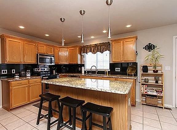 Move in ready and updated home with finished basement and backing to open space! Beautiful kitchen features slab granite countertops, a convenient kitchen island and stainless steel appliances including smooth top stove, dishwasher and microwave. Tile floors through kitchen and eating space plus pantry for storage. Gas fireplace at family room, plus there are a formal living and dining rooms. Three beds upstairs including master suite with five piece bath, full hall bath and convenient laundry. Finished basement features good sized rec room. Relax on the no maintenance deck with no neighbor directly behind. Central air, new 50 gallon water heater, front and back sprinkler - this home has been proudly maintained by the original owner!