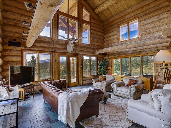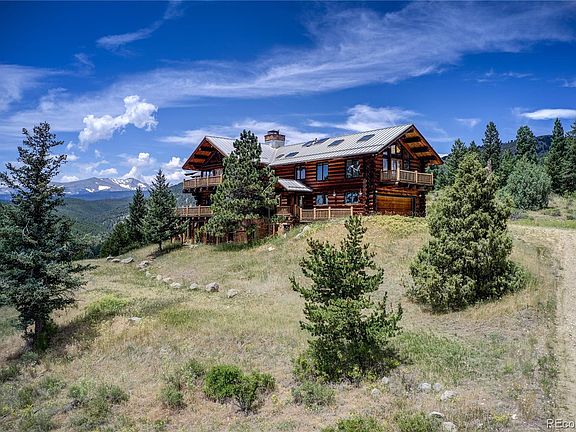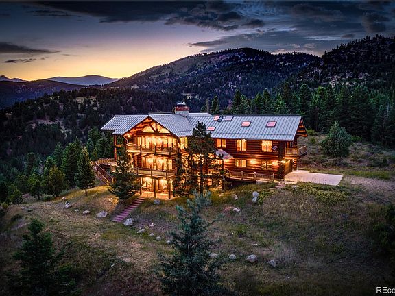 Luxurious mountain top oasis. Protected views will never be built upon: property includes plots on adjacent mountain tops & spans 111 acres. Enjoy the best of both worlds; ultimate privacy and close to Boulder. Exceptional craftsmanship throughout with Swedish Cope 24" logs and intricate details. Accents include wrought iron aspen leaf circular railing, 3 story stone fireplace (double sided on 2 levels) that illuminates 5 areas of the house. Chef's kitchen outfitted w/premium appliances flows to dining area w/beautiful stained glass window. Soaring vaulted ceilings, track lighting, and radiant heated slate flooring open to wraparound deck with unobstructed views of Rocky Mountain National Park, Continental Divide, Boulder city lights, and local wildlife. Master suite complete with private balcony is spacious & bright. Rec room offers wet bar, sauna, and game area. Detached garage with woodworking shop, vintage wood burning stove, and storage that top off this ideal mountain paradise!