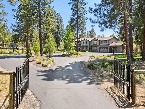 Set on over two acres, this gated, beautifully manicured property in desirable Woodside Ranch offers privacy in a park-like setting. The stunning 4,510 sf remodeled home offers 5 bedrooms, 4.5 baths, vaulted great room, separate living room, formal dining room bonus room and office, all with tons of windows and fabulous natural light. Featuring a tasteful kitchen with views of the expansive backyard and outfitted with an oversized Jenn Air gas range, double ovens, large pantry, updated cabinetry, and pot filler faucet. Additional amenities include white oak floors, new carpet, 3 fireplaces (two propane and one wood burning), forced air heat, A/C, central vacuum, and an oversized 3 car garage. Outside features include a wrap around porch with multiple seating areas, built in BBQ, gas firepit, hot tub, built in planter boxes, playground, chicken coop, storage shed, garden beds, and RV parking; fully fenced in and bordering National Forest property. This is a Bend, Oregon gem!