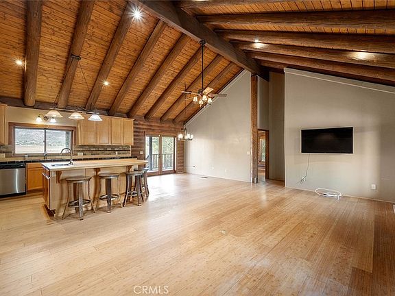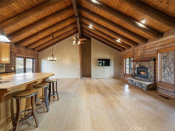Inside, the home features huge open beam ceilings, bamboo wood floors, and a gorgeous rock fireplace insert by "Fireplace Extraordinaire" designed to be "sootless". The kitchen boasts a butcher block island with an extra sink, a seating area with wine barrel stools, stunning views from the kitchen window, tile counters, stainless appliances, and pull-out shelving in the cabinets.