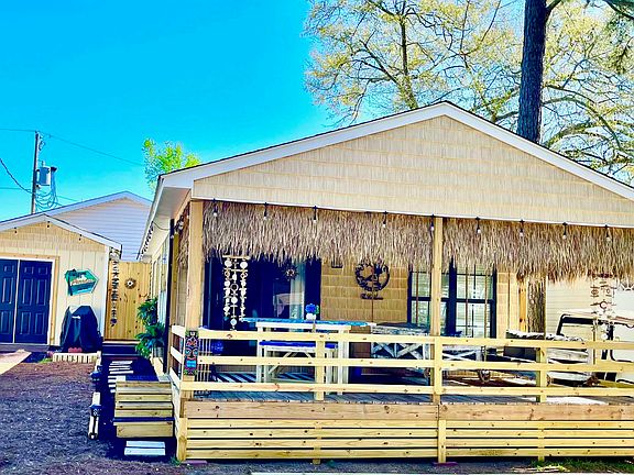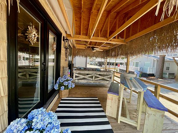 BRAND NEW EVERYTHING ON THIS STUNNING 3 BED/2 BATH BEACH BUNGALOW WITH OPEN CONCEPT FLOOR PLAN AND AMAZING COVERED FRONT PORCH COMPLETE WITH CUSTOM MADE PORCH BED SWINGS! LOCATED IN OCEAN LAKES THIS FORMER CAMPER HAS A NEW STICKBUILT ADDITION ALONG WITH A COMPLETE REMODEL! ABSOLUTELY TURNKEY! New roof in Oct. 2021. New HVAC in July 2022. Home boasts of NEW LVT flooring throughout the entire house with NEW furniture and NEW decor. 65” flat screen smart TV above a very aesthetic, color changing, electric fireplace w heater. Beautiful dining table with 4 seats and kitchen island w 2 stools. Kitchen has all brand new white cabinets w granite countertops and a marble backsplash, builtin stainless microwave over new stainless steel 5 burner range/oven, new stainless side by side refrigerator, shiplap walls and some modern open shelving with LED color changing accent lighting. Master bedroom is a beautiful blue and white nautical theme with gold accents. It has a king size canopy bed, a roomy dresser, a large full length mirror, a beautiful vanity and stool w lighted makeup mirror and a 50“ flatscreen smart TV. Master bedroom includes an ensuite with huge walk in shower, linen closet and vanity sink with lighted water faucet! Private entrance to the master bedroom and private outdoor shower that has hot/cold water with a light up shower head! Outdoor Shower can also be accessed from the front of the home. 2nd bedroom has a brand new queen bed with new memory foam 12” mattress on an 18” high frame w storage underneath for suit cases, etc. Also includes a flat screen smart TV, full length mirror, corner open shelf for clothing, and 2” wood blinds for privacy. 3rd bedroom has a full-size, very comfy bed w storage underneath for suitcases, shoes etc., flat screen smart TV, nightstand and convenient USB ports for charging phones, etc. Above the full size bed is a built-in twin that is suitable for a child and a builtin closet. 2nd bathroom is a smaller jack and Jill bathroom between the 2nd and 3rd bedrooms with tub/shower combo and great water pressure! The brand new front porch is the goto spot for relaxing or golf cart watching and includes an outdoor "Surf" table with benches and 2 relaxing twin size porch bed swings, ceiling fan and a 43” flat screen TV. Front porch makes the perfect late night hang out spot or early morning reading spot or... anytime of day napping spot! Home comes completely furnished as seen in pics including washer/dryer and 2nd refrigerator in detached building, gas grill and Club Car golf cart. Large mirror and the two side sconces do not convey.  There is no HOA in Ocean Lakes however, all permanent home sites are located on leased land, which are payed in semiannual installments due in January and July. Award winning Ocean Lakes' gated community includes almost a mile of pristine white sand beach, 24 hour security, trash pick-up, free cable TV, indoor/outdoor swimming pools, water park/slides, lazy river, splash zone, new dog park in 2022, 2 full size basketball courts, miniature golf, fire pit, corn hole, shuffle board, horseshoes, ping-pong, Sandy's Down-under skatepark, recreation building, arcade, general store, golf cart rentals, Sandys Meet & Eat restaurant and more!