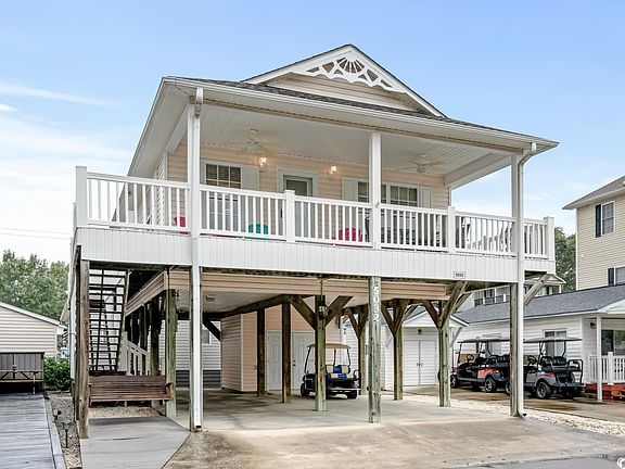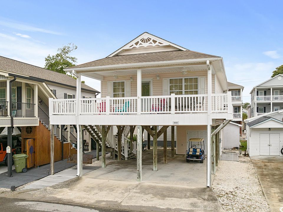 A must see, rare opportunity for a raised beach house on Scallop Dr. to hit the market. This property has never been rented and is in the very desirable 5000 section of Ocean Lakes with a view of the ocean. This 3 bedroom 2 bath raised beach house is being sold fully furnished. Washer/dryer is located inside the home, water heater is in the downstairs garage. Wrap around deck and under house entertaining area with concrete/composite decking/rocks for easy upkeep. Split bedroom floor plan with large living area, dining area, kitchen with side entry. Master bedroom with attached bath is in the front of the house that will have morning sun and afternoon shade, 2 other bedrooms are located in the rear of the house with a full bath in the hall. From the deck you can see the sunrise, enjoy the ocean breeze while listening to the waves crashing onto the shore. In the evening watch the fireworks. Very close proximity to all amenities that Ocean Lakes has to offer.