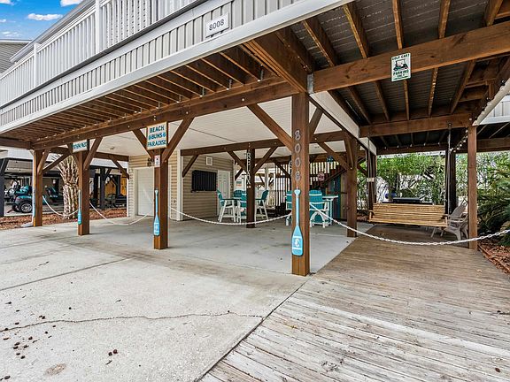 Welcome to 8008, this 3-bedroom 2 bath raised beach house was built in 2001, new metal roof in 2018, covered steps, composite decking completed in 2018, HVAC replaced in 2015. Golf Cart garage has a new mini-split system for climate control, added in 2023. Downstairs has 3 parking bays as well as ground decking for golf cart parking. Golf cart and composite outdoor patio furniture does not convey however can be purchased separately or included in a higher offer. Under the raised beach house offers a large entertaining area with TV, outdoor shower with hot and cold water, and a swing. Going up the covered steps you have composite steps and decking leading to an oversized covered porch and uncovered deck on the north and east side. Entering the home you have the living room with vaulted ceilings and ceiling fan, open concept kitchen with stainless steel appliances (new in 2023), breakfast bar, dining area, and side door off the kitchen with access to the front deck. On the South side of the house you have stackable washer/dryer in its own closet, full bathroom with tub/shower combo and 2 bedrooms (bunks in one and queen bed in the other). Primary bedroom is off the living room as you enter the home on the right with queen bed and attached full bathroom. The entire interior of the home was repainted in 2023 as well as new furniture in 2023. Being sold furnished