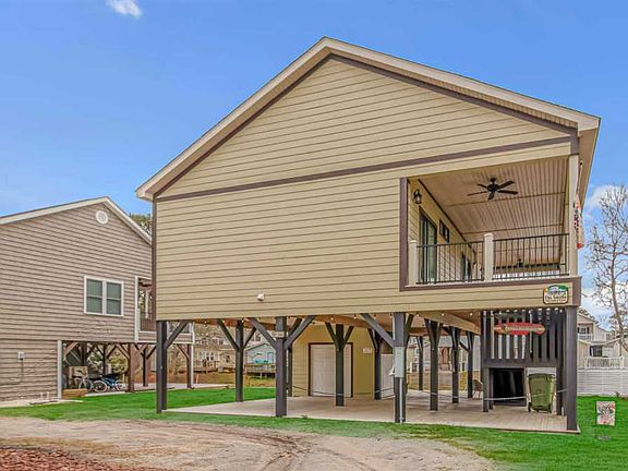 Here is the chance to own a quality crafted home in the award winning Ocean Lakes Family Campground. This custom built 3 bedroom 2 bath raised beach home exudes southern charm, comfort, and stands out from the others! Home is perfectly situated on a spacious lot with lots of room to spread out and park! As you walk up the covered steps, you're greeted by a large covered wrap around porch so you can sit back and enjoy the breathtaking views of the canal that leads to Magnolia Lake. Every detail was carefully thought about when this home was built. Home boasts ceramic tile flooring throughout the main living spaces, granite counter tops, vaulted ceilings in the living room and kitchen, tile showers, Hardy Plank siding and is beautifully furnished. The kitchen offers plenty of prep space, granite counter tops, stainless steel appliances, and a tile backsplash. You will be sure to love the master oasis that offers a tile shower with a double vanity. The master bedroom has an sliding door that leads out to the back half of the covered porch. With two more spacious bedrooms and a hall bath, this home has plenty of space for all your guests. Located in the much desirable Mobile Home section of the campground, this home is just a short walk down to the beach. Home is conveniently located close to all the amenities that comes along with Ocean Lakes Family Campground. Amenities included are indoor/outdoor pools, lazy river, waterpark, mini-golf, arcade, basketball courts, volleyball courts, and much more! Come check out this property today! All measurements are approximate and not guaranteed. Buyer responsible for verification.