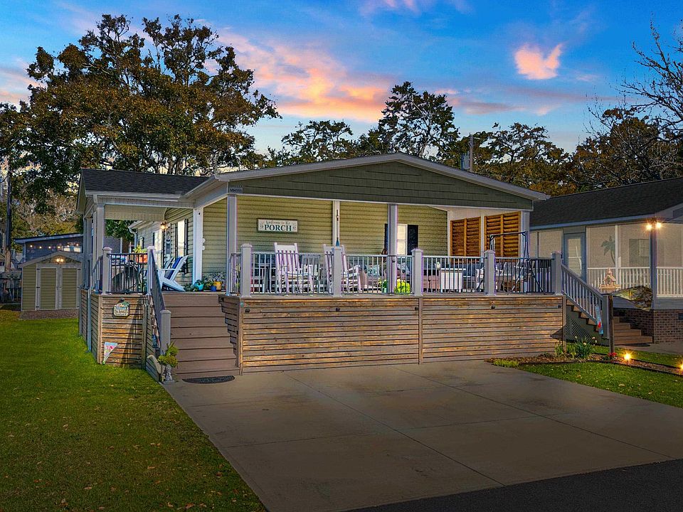 GEORGIOUS and IMMACULATE, well maintained, 3-bedroom 2 bath 2017 (28x40) doublewide on a DOUBLE lot with incredible views of Magnolia Lake. This home was built in 2017 (New front porch completed in 2020). Main porch features a 12 ft COVERED porch (additional decking past the 12 ft covered porch). Louvered panels on the North side of the porch so you can enjoy the huge outdoor space and lake views at MH-111. Conversational set, TV, composite table and 6 chairs, porch swing, and rocking chairs will convey with the sale to enjoy relaxing times on the porch. The South side covered porch offers 4 composite Adirondack chairs and the main entrance to the home. As you enter MH-111 you have a large living room and open concept kitchen with Breakfast bar, Island, and dining area. The master suite is located on the East side of the home with a large master bath including double vanity and garden tub/shower. Bedrooms #2 and #3 are located on the West side of the home and share bath #2. Bedroom #2 has bunk beds and bedroom #3 has a queen bed. ALL windows have Plantation Shutters to enhance the beauty and elegance of this home. Laundry room has full-size washer and dryer along with a side door exiting to the North of the home. The backyard has string LED lights, firepit, sitting area, 6x6 outdoor shower, gardening shed, utility shed, and golf cart car port. The rear of this home is on a service road for convenient access to additional parking and rear of the double lot. Schedule a showing today of this fully furnished property.
