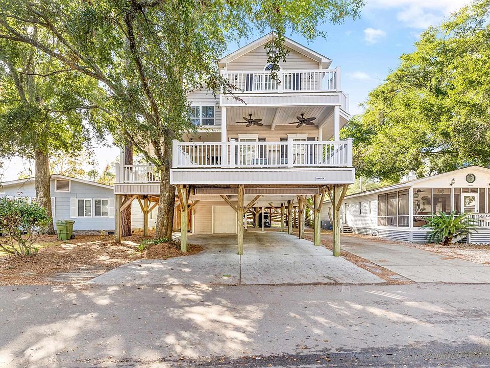 Just 2 blocks from the BEACH in the highly desirable Ocean Lakes Campground. 310 acre Gated community is situated on 1 mile of white sand beaches. This Raised Beach home comes FULLY FURNISHED and is an active rental in the OL Property Management Program. Features 5 FULL Bedrooms, 4.5 Bathrooms, a Dining area, Living Room, and a Huge wrap around Covered Porch. Sip coffee and Watch the action all day! You could easily sleep 8-10 comfortably. This home comes with a golf cart garage on bottom floor, outdoor shower, and you are just 1 floor up to your home away from home. 2 entrances. Plenty of parking and covered parking or space for outdoor entertaining. Home is constructed on Leased Land which is paid - split into 2 payments a year and includes amenities such as: 24 hour security, 310 acres of community, 1 mile of white sand beach, trash pick-up, basic cable, shuffle board, fire pit, mini golf, shaded cornhole area, volleyball, 2 basketball courts, a lazy river, waterslides, splash zone, horseshoes area, arcade, sandy's meet and eat, laundry building, general store, recreation building, skate park, golf cart rentals, ping-pong and more! This home has been used as a SHORT TERM rental. Owners replaced both HVACs in last 3 years. Golf cart Negotiable!