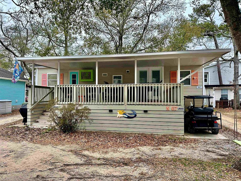 N-67 a very well maintained tiny home located in the award winning Ocean Lakes Family Campground. Perfectly situated right in the heart of the campground, walking distance to the waterpark, store, and all amazing amenities. Large covered outdoor deck for entertaining that spans the length of the tiny home. As you enter the home you're greeted by an open concept living space that is directly open to the beautiful kitchen. One bedroom is in the rear of the home, another bedroom area is separated by a curtain in the front of the home (wall with barn door can easily be added for a true 2 bedroom. With 1 full bathroom, there is plenty of space for everyone. Coming fully furnished, so all you will need is your suitcase here at site N-67 in Ocean Lakes. Come check out this property today! All measurements approximate and not guaranteed. Buyer is responsible for verification. HVAC and Roof were replaced in 2017. Professional pictures will come on Wednesday. HUGE lot, full size washer/dryer is located in the shed along with extra frig. and room to park a golf cart.