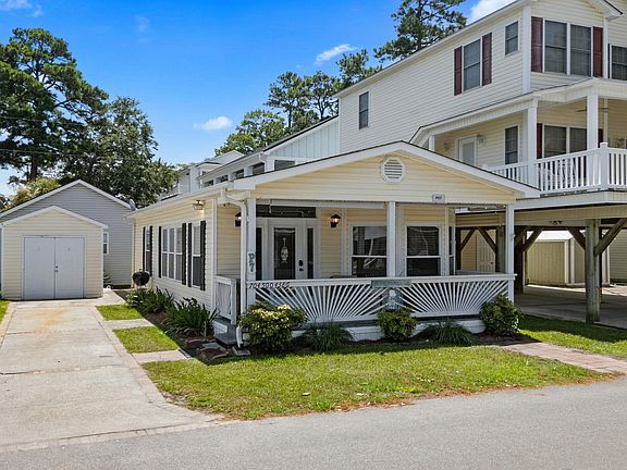 Welcome to site P7 located on Ibis Dr. in Ocean Lakes. This 3-bedroom 2 bath is being sold fully furnished. P7 has a great covered front porch, large living room with open concept kitchen and dining area. Home has LVP flooring and coastal decor. Kitchen has stainless steel appliances (including dishwasher), backsplash, island with seating for 2 and breakfast nook with table and 4 chairs. The primary bedroom has a queen size bed with attached full bath with walk-in tiled shower, and rear door leading to the backyard. Bedroom #2 and #2 share another full bath with tub/shower combo. Stackable washer/dryer is located inside the home as you make your way down the hall. Concrete driveway with plenty of room for parking, detached storage building large enough to hold a golf cart (cart not included), lawnmower, yard tools, and beach items. Ask your agent or Realtor about rental income on this home!