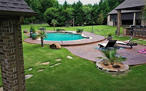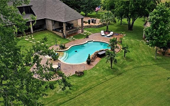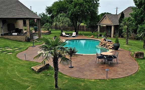 Incredible 1.8 ac gated estate home on a highly desirable lot in the prestigious Orchards on Eagle Mountain Lake! Show-stopping grounds feature outdoor kitchen, 2 covered patios, electric shades, pool, putting & chipping green, basketball sport court, stained concrete, & 900 sqft guest house. The 4,000 sqft property boasts an open living & kitchen area. The kitchen offers new SS Bosch appliances with a built-in cappuccino maker. Main level master with double tray ceilings, expansive en-suite bath with new travertine, huge closet with built-ins & access to the backyard oasis. Enjoy the lush green lawn with mature trees, extra large 3 car garage and an infinite amount of privacy. You'll love this property!