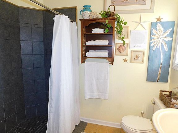 This beautiful cozy 4 bdrm 3.5 bath; handicap home has so much to offer including a newly installed upstairs HVAC system. A wonderful sitting area on every deck including under the house. The Master Bedroom on the main level has a handicap shower. 2 Master King suites with large flat screen tv's and ceiling fans, 1 King Bdrm, 1 bdrm with 2 Twin over Double Bunks, with large screen tv's and ceiling fans The Family room features a sofa, love seat, and Recliner with Large wide screen tv. Dining area has table to seat 4, and 3 extra bar stools at the bar. The Fully equipped kitchen is wide and spacious plenty of room for cooking, stainless steel refrigerator, dish washer, oven and microwave Half Bath is off the kitchen area The King Master bdrm on the main level features a dresser, 2 night stands, wide screen tv with a handicap bath with pedestal sink The King Palm Bedroom features a dresser, nightstands and chair. This Master has a door to exit onto the beautiful top deck to sit relax and take in the salt air. Featuring wicker deck furniture and rocking chairs The Fish room to the right of the Master also features a King size bed with large wide screen tv and ceiling fan. The Surf room is down the hall featuring 2 twin over double beds. This is the perfect room for children with the flat screen tv, a DVD player with movies and a play station and games. The Full Bath is between the Fish and Surf room featuring a tub shower combo The large laundry room is on the upper level with a mud sink, and large capacity washer and dryer The Decks have SO much to offer with the beautiful seating areas, as well as under the house. There is a side deck under the house that has a small dining table. Outdoor shower. There is a full attic and a garage. This house also has an enclosed potty spot for dogs. House comes fully furnished.