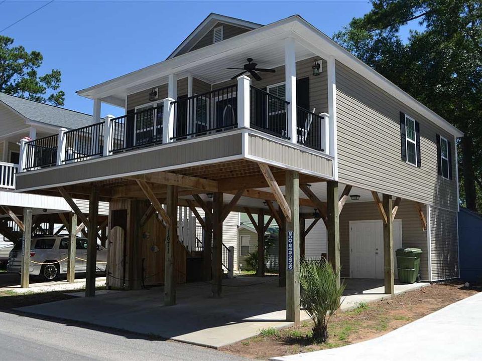 Beautiful 3 bedroom and 2 bath raised beach home located in the award winning Ocean Lakes community. This home is sold completely furnished including the washer and dryer. You are sure to love the open and airy floor plan. The home has laminate flooring throughout the home and ceramic tile in both bathrooms. The decking and stairs are made of composite material so need need to seal or ever stain. There is a downstairs area for entertaining with TV hook ups and a ceiling fan to help keep you cool. Relax on the large deck which is partially covered while sipping your sweet tea. Home has great rental history or can be used as a primary residence. Ocean Lakes is a 300 acre ocean front complex with 24 hour security. You are sure to love all of the amenities that Ocean Lakes has to offer including indoor and outdoor swimming pools, water park with slides and lazy river, splash zone, basketball courts, volleyball, shuffle board, horse shoes and much much more. Short term rental is allowed in Ocean Lakes. Please do not miss this property. Square footage is approximate and not guaranteed. Buyer is responsible for verification.