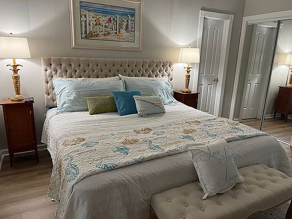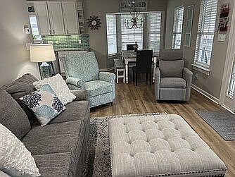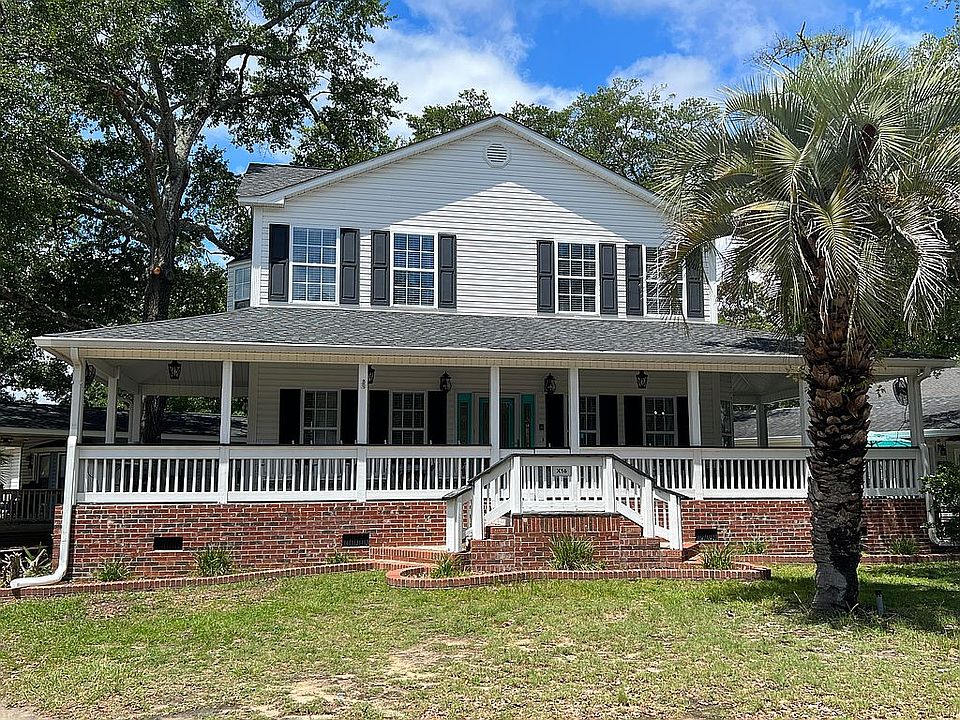 Ocean Lakes Southern Living Home This home is on a great corner lot close to water park, pools, store, and two lakes. Three on suite master bedrooms which are all very spacious with king sized beds and two of the bedrooms have built in bunks. The home has a full wrap around porch second to none with a row of rocking chairs and a sitting area with tv. There is also a chefs kitchen complete with granite countertops and fully stocked cabinets. This home has a front yard which is rare in Ocean Lakes. There is a paved concrete driveway with a spacious building to house your toys or golf cart. Separate HVAC units for upstairs and downstairs. All bedrooms, living room, and outside sitting area has flat screen Samsung TV's. Completely furnished.