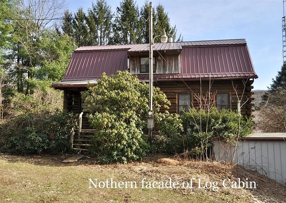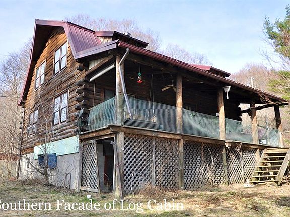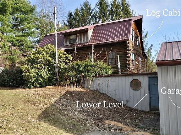 Excellent Opportunity for those seeking privacy, acreage, log home, several workshops and are able to do their own work. Strong flexible financing is a must. Three levels of living in this custom built log home with attached oversized 2 car garage. The acreage is sloped and full of mature trees and a stream borders one side of the property. 3 levels of living in this custom log home with upper bedroom and loft area, main level with two rooms and access to the private back deck. The lower level includes the original kitchen area, full bath, office area, utilities and storage. Financing needs that understands that there are 3 lots and that it is selling in current condition and without title to the work shop behind the house. Metal roof. The attached 2 oversized 2 car garage is attached to the lower level of the home. The acreage is the sum of the 3 parcels.