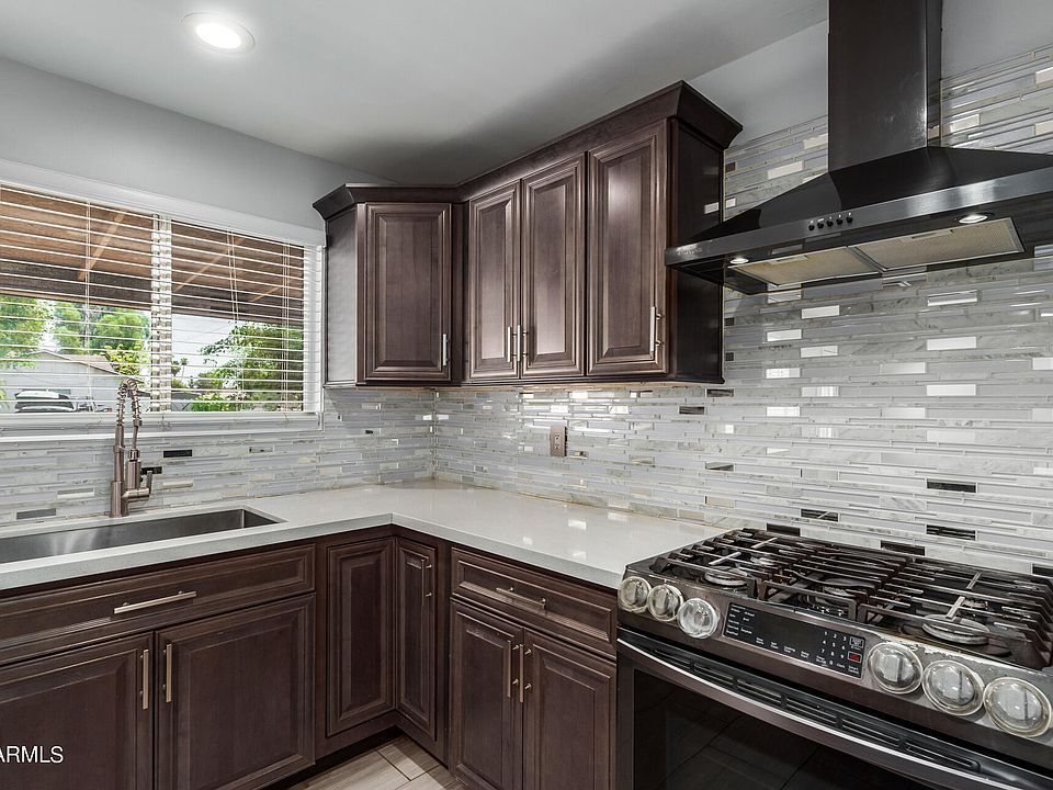 Home, sweet home! Charming 4 bed, 2 bath corner lot residence in Glendale is now on the market! You'll be greeted by a harmonious interior showcasing soothing color palette, neutral tile flooring, recessed lighting, and an enchanting stone-accented wall. The spotless kitchen boasts quartz counters, chocolate-stained cabinets with tasteful crown moulding, black stainless steel appliances, stylish mosaic backsplash, and a center island complete with a breakfast bar, perfect for casual dining or quick snacks. Primary bedroom offers a pristine ensuite featuring a designer's tile shower. This property is ideally situated close to schools, parks, markets, and more! Don't miss out on this one!