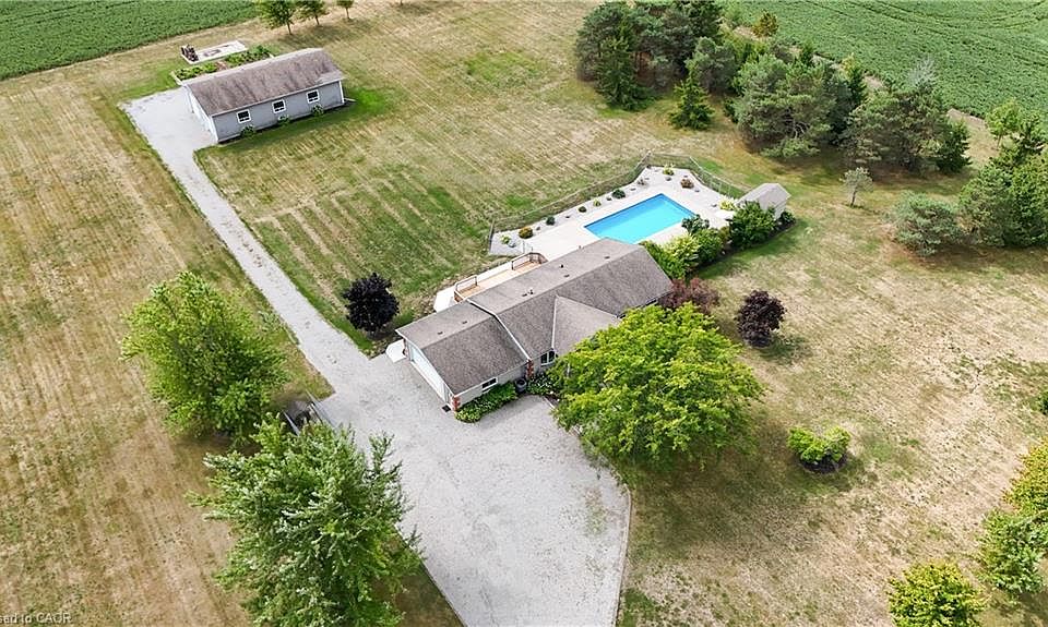 Stunning raised brick bungalow on 3.93 acres offering space, privacy, and endless possibilities! This 1,078 sqft home plus fully finished lower level (1,120 sq. ft.) shows true pride of ownership throughout. The main floor features a bright living room with bay window and hardwood flooring, a custom kitchen with quartz countertops, oak cabinetry, coffee bar, and ceramic tile floors, plus a dining room with garden doors leading to a huge 14’ x 32’ deck overlooking the backyard oasis. Three spacious bedrooms and an updated 4-piece bath with quartz vanity and Mirolin tub complete the level. The lower level offers even more living space with a massive rec room and cozy gas fireplace, a 4th bedroom, 3-piece bath, large laundry, and cold cellar. Freshly painted throughout with numerous updates: furnace & A/C (2023), windows & doors (last 10 years), roof (2008), water pump (2025), and more. Enjoy summer days in your 16’ x 32’ inground family pool (liner & pump approx. 7 yrs), entertain on the large concrete patio, or gather by the fire pit. Car enthusiasts and hobbyists will love the 30’ x 50’ workshop (2008) with mezzanine and 2 overhead doors (12’x12’ & 8’x10’), built in 2008. Double attached insulated garage with welder plug. Central vac, gas BBQ hookup, and 5,000-gallon cistern under the garage add to the value. Located just 10 minutes to Dunnville and 15 minutes to Cayuga, this property offers country living with quick access to town amenities. A true must-see!