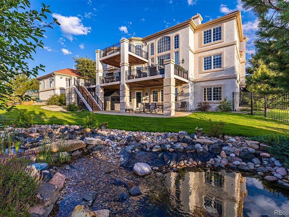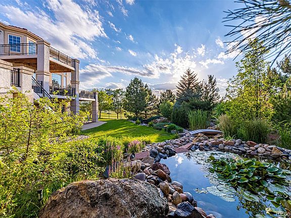 This Spectacular 5-bedroom residence nestled on over 2.5 acres of land in the popular High Prairie Farms community will leave you in awe! This masterpiece displays an exquisite curb appeal with manicured landscape and a spacious 7-car attached garage. Discover a captivating interior showcasing an impressive foyer, high ceilings, bountiful natural light, plantation shutters, designer palette, formal dining area, and four superb fireplaces in the living areas as well as the master suite. The stunning chef's kitchen is a cook's dream offering gourmet stainless steel appliances, custom white cabinetry with windowed cupboards, designer slab granite counters/backsplash, chef double wall ovens, recessed accent lighting, a walk-in pantry, wine cooler, and a large island with a breakfast bar and built-in wine rack. Primary suite highlights an amazing two-way fireplace, a lavish ensuite with dual sinks, an oversized walk-in closet suite, and private access to 3rd story balcony with endless mountain, golf course and horse pasture views. Let's not forget about the fabulous basement featuring an entertainment area with a full bar, custom designed projection theater room, bonus area, office/bedroom and full bath, transforming casual evenings into memorable social gatherings! The gorgeous backyard comprised of a charming deck, a covered patio, an enchanting garden waterfall and pond, and double gas fire pits acts as an all-season outdoor living and entertaining area area. Perfectly designed for year-round enjoyment, it is a serene spot to sit back and unwind or engage in heartwarming conversations! This is a once in a lifetime opportunity to own a piece of Colorado paradise. Don't just imagine it! Don't let this beauty pass you by!