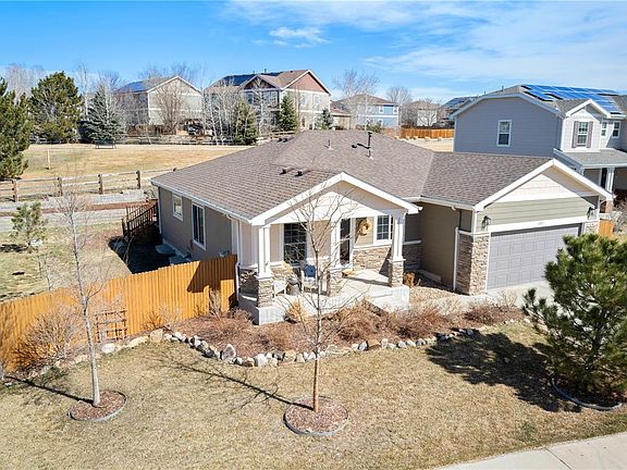OPEN HOUSE SATURDAY MARCH 25, 12:00-2:00pm. One level living on a premium lot at the end of a quiet cul-de-sac. This location can’t be beat! Backs and sides to open space and bike path, and the views from the covered front porch of the mountains and Springvale Park and disc golf course are amazing. Step inside to all new interior paint for a fresh and vibrant feeling. Hardwood floors grace the living room, dining room, kitchen, and family room. Wonderful open floor plan with great flow for entertaining. There is a place for everything in the kitchen with an abundance of beautiful honey toned cabinets accented with granite countertops, stainless steel appliances and a spacious island with prep sink and bar seating. There is a formal living area as well as a family room on the main level. The home is flooded with natural light throughout. 3 bedrooms plus an office with French doors, perfect for privacy for those who work from home. All 3 bedrooms and office have new carpeting. Primary suite with walk-in closet and ¾ en-suite bath. Convenient main floor laundry. Backyard features a raised deck with views to the open space and bike path. Need room to grow? Double your living space by finishing the full basement, featuring 9 egress windows and rough-in plumbing. New roof in 2018 and new hot water heater in 2019. Walk to Trail Winds Park, Open Space and Rec Center and the Veteran's Memorial Aquatic Center.