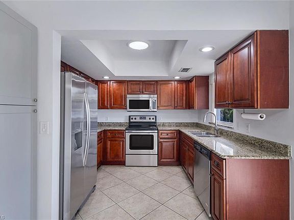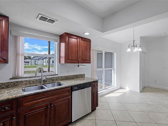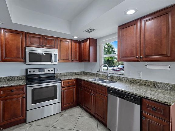 NEW REDUCED PRICE!! This delightful home features 3 bedrooms. 2 bath and attached garage encompasses a total of 1220 square feet of living space on a spacious 6098 square foot lot. Step inside and be greeted by a newly renovated interior. Carpet in bedrooms, vanities in both bathrooms, tiled walk-in shower in master bathroom, tiled bath in guest bedroom and painted. Skylight in living room vaulted ceiling and private outdoor space offers a tranquil retreat for relaxation. New water heater 2023, new gutters, a/c, air handler & roof inspected July 2024. Located in Quail Hollow. Low HOA fees. Corner of Rattlesnake Rd and Santa Barbara Blvd. Close proximity to shopping, dining, beaches and I-75.