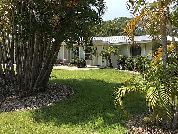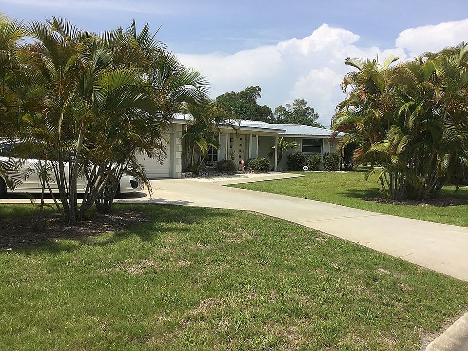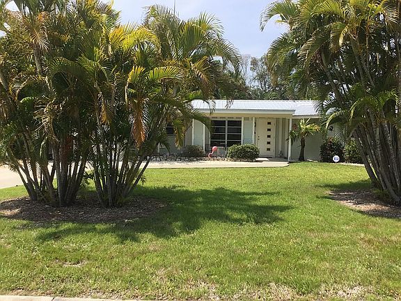 Fabulous Northwest Bradenton Pool home. This late Mid Century Modern Style home sits on a tropical spacious corner lot. This home is minutes from the boat ramp and of course a short drive to Anna Maria Island. This home was designed and built by Ruth Richmond and still retains most of her trademark lucite door handles and cabinet pulls. Most of the house is still original and has been well cared for. This is not your typical cookie cutter home or basic rancher. Every square inch is well thought out and used in a way that the house feels much larger than its square footage shows. The main living area along with kitchen and Master bedroom all have sliding doors that fully open and disappear giving the enclosed lanai the appearance of being part of the house. Mrs. Richmond intentionally designed this and during season is absolutely wonderful to have the house opened up making it feel as if you were outside in the comfort of your home. The Master bedroom is spacious and has a walk in closet along with a private bathroom with her curved shower with all original wall tile. The main bathroom is very spacious and is all original. The house curves in a lazy L design out to the kitchen that was remodeled with all wood cabinetry and granite counter tops. All kitchen appliances stay. The home retains its original and beautiful terrazzo floors with terra-cotta and grey diamond chips. The floor was diamond honed 6 years ago. The HVAC was all new 5 years ago including all attic ductwork. The home has a newer steel roof as well. The corner lot that this home sits on is like having your own private paradise with mature Areca palms through out along with a heated in ground free form pool. This house has so much potential as a vacation rental or seasonal rental. Last but not least there is also a spacious 1 car garage with laundry area. This is a true Florida home!