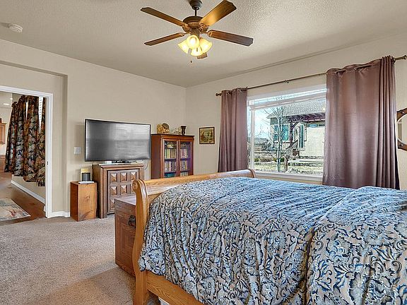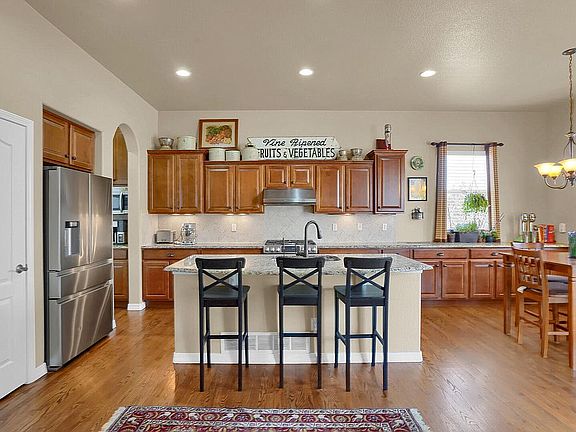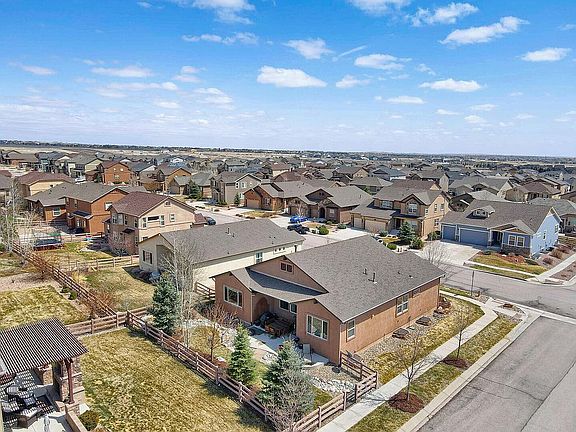 This home boasts a large master suite on the main level as well as an open-concept gourmet kitchen featuring gas oven/range, upgraded Kitchen-aid dishwasher, granite countertops, and a large amount of cabinetry. Formal dining room with crown molding and arched entry joins the kitchen via coffee bar area. South facing property on a quieter street is great for a fast melt of your driveway after snowfall, has a fenced back yard and is fully landscaped. Beautiful backyard waterfall feature adds a soothing ambiance during outdoor evening gatherings. Finished basement level has an enormous great room with deluxe bar and features two additional bedrooms, for a total of four, all with new carpet. Plus a spacious, fully finished office / crafting room is perfect for the stay-at-home professional or hobbyist. Three car garage features a lift in the single bay. Carefree living in the beautiful Wolf Ranch Subdivision! Walking trails and parks throughout this lovely family-friendly neighborhood.