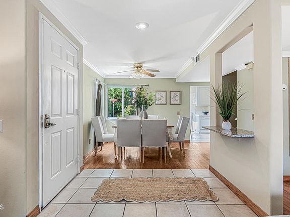 Step into a home that blends natural light, thoughtful layout, and comfortable elegance to create a relaxing and effortless living experience. Upon entry, you're welcomed by a bright, open space with large windows that invite the outdoors in. The living room flows seamlessly into the dining area, creating a sense of continuity, further enhanced by custom crown molding, adding an elegant, refined touch to the ground level.The kitchen is smartly designed with modern cabinetry, ample counter space, and an intuitive layout that makes meal prep and entertaining a breeze. It's close proximity to the dining area ensures that you will stay connected with guests while hosting.A versatile downstairs bedroom offers flexibility as a guest suite, office, or private retreat. Included is a nearby full bath and direct access to your private back yard area via sliding glass doors. Vaulted ceilings throughout amplify the home's sense of openness and light.Upstairs, the spacious primary suite features vaulted ceilings, a generous walk-in closet, and a private en-suite bath, creating a serene and restful retreat. The upper-level layout is designed for privacy as the bedroom is tucked away from the downstairs gathering spaces.The backyard is a true highlight. Previous owner used back yard garden area for organic vegetable gardening, successfully growing seasonal vegetables for the past 14 years. Besides plenty of colorful, ornamental plants, this rare feature (availability of existing fertile soil built-up) offers a unique opportunity for eco-conscious living and plentiful, healthy future veggie harvests for the new owner. Set in one of the community's more private and tranquil locations, this home also features a more intricate and lush public landscape design than most surrounding units, perfect for those who value artistic expression, seclusion, and pure natural beauty.HOA amenities include exterior maintenance, insurance for the tile roof, and access to the beautifully furnished pool area and clubhouse which are conveniently located right next door.This home also offers exclusive use of both the backyard and a portion of the front area, adding valuable outdoor space rarely available in similar communities.