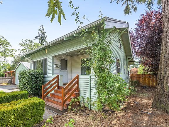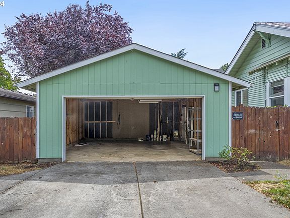 Cozy and cute on a corner lot, this 2 bed 1 bath bungalow boasts a full basement with outside egress/entry only (future ADU?) and a 25X22' oversized double garage (possibly fit 4 cars tandem? many bikes, boat?), and wide driveway. It's a toy-lover or hobbyist's dream! Updated kitchen with SS appliances, large dining nook, slab granite counter tops, sky lights, doggie door. Bathroom with OG clawfoot tub. Newly carpeted throughout. Spacious living room with big picture window and big bay window, lots of light! Low-maintenance exterior! Established landscaping with multiple garden boxes, cherry and peach trees, private back yard with patio, covered porch, jasmine shrubs. Updates: The roof is partial metal and partial composite shingles (new composite shingles installed 2023). New cedar fence (2023). Copper hot water pipes and newer water heater (2018). New skylights (2023). New gutters (2023). Sewer lined (2014). Convenient location with quick access to Woodstock and Foster neighborhoods, bus lines and biking greenways. Please note: Scooters have been removed from property, just showing how much space there is in the unusually large urban garage!! [Home Energy Score = 5. HES Report at https://rpt.greenbuildingregistry.com/hes/OR10232239]