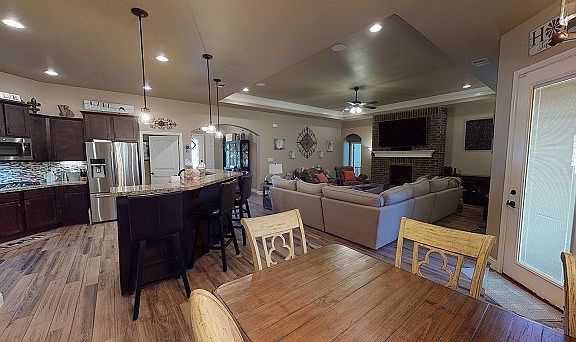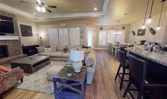 This home sits on a premium large corner lot with tons of space for a pool, outdoor kitchen or play system. The new owner will have endless possibilities! Upgrades include:floor to ceiling brick fireplace, wood look tile, plantation shutters, farmhouse sink, double ovens, gas range, under cabinet lighting and permanently installed speakers, lighting package, upgraded cabinets, RO/softener. WOW!